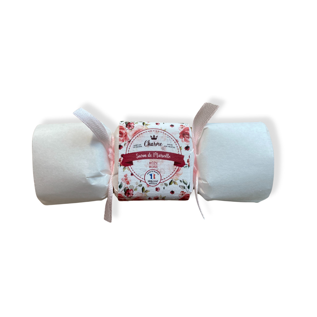 Francouzské luxusní přírodní mýdélko 25 g ve tvaru bonbónu zdobené mašlí s jemnou vůní rozkvetlých růží, obsahuje bambucké máslo, 72 % přírodních olejů a je provoněno vůněmi z GRASSE . Vhodné jako krásný a voňavý dáreček.