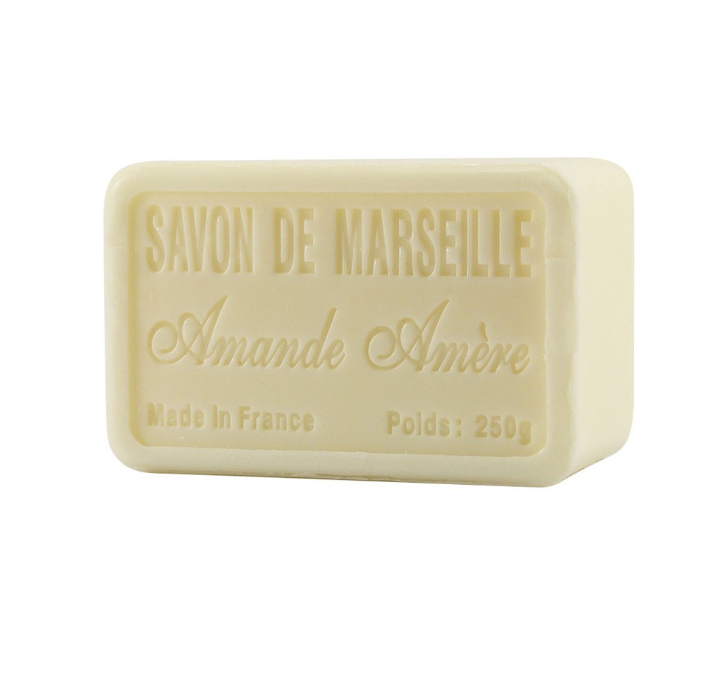 Francouzské luxusní přírodní mýdlo,vyrobené podle tradiční marseillské receptury,jejíž původ ve Francii sahá až do 17.století, ve tvaru 250 g obdelníku, s velice intenzivní a současně velmi příjemnou vůní hořké mandle.Mýdlo obsahuje bambucké máslo a 72% přírodních olejů, které blahodárně působí na pokožku,zanechávájí ji vláčnou a nevysušenou.