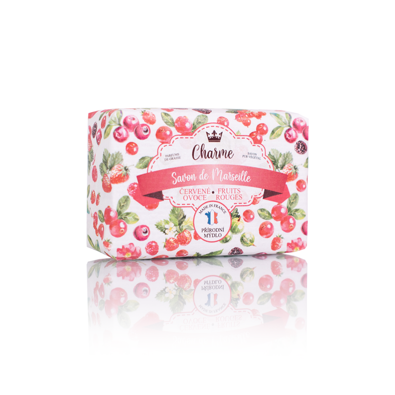 Francouzské luxusní přírodní mýdlo ,vyrobené podle tradiční marseillské receptury ,jejíž původ ve Francii sahá až do 17.století, ve tvaru 100 g obdélníku, vonící po sladkých vyzrálých plodech letního červeného ovoce, jedna z nejoblíbenějších vůní, která se jen tak neomrzí. Mýdlo obsahuje bambucké máslo a 72% přírodních olejů je provoněno parfémy z GRASSE . Mýdlo blahodárně působí na pokožku, zanechává ji vláčnou a nevysušenou.