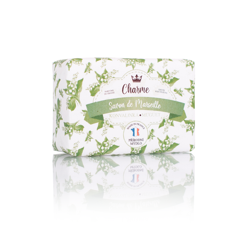 Francouzské luxusní přírodní mýdlo, vyrobené podle tradiční marseillské receptury ,jejíž původ ve Francii sahá až do 17.století, ve tvaru 100 g obdélníku, s intenzivní vůní rozkvetlých konvalinek, připomínající procházku jarním lesem .Mýdlo obsahuje bambucké máslo a 72% přírodních olejů je provoněno parfémy z GRASSE . Mýdlo blahodárně působí na pokožku, zanechává ji vláčnou a nevysušenou.