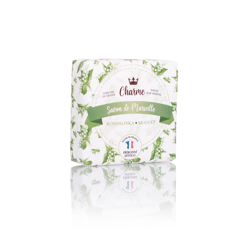 Francouzské luxusní přírodní mýdlo ,vyrobené podle tradiční marseillské receptury ,jejíž původ ve Francii sahá až do 17.století, ve tvaru 50 g čtverce, s okouzlující a pronikavou vůní rozkvetlých konvalinek .Mýdlo obsahuje bambucké máslo a 72% přírodních olejů je provoněno parfémy z GRASSE . Mýdlo blahodárně působí na pokožku ,zanechává ji vláčnou a nevysušenou.