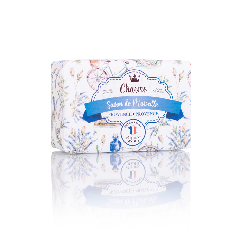 Francouzské luxusní přírodní mýdlo ,vyrobené podle tradiční marseillské receptury, jejíž původ ve Francii sahá až do 17.století, ve tvaru 100 g obdélníku, s velmi specifickou vůní bylinek navozujících kouzelnou atmosféru slunné Provence. Mýdlo obsahuje bambucké máslo a 72% přírodních je provoněno parfémy z GRASSE . Mýdlo blahodárně působí na pokožku , zanechává ji jemnou a vláčnou.