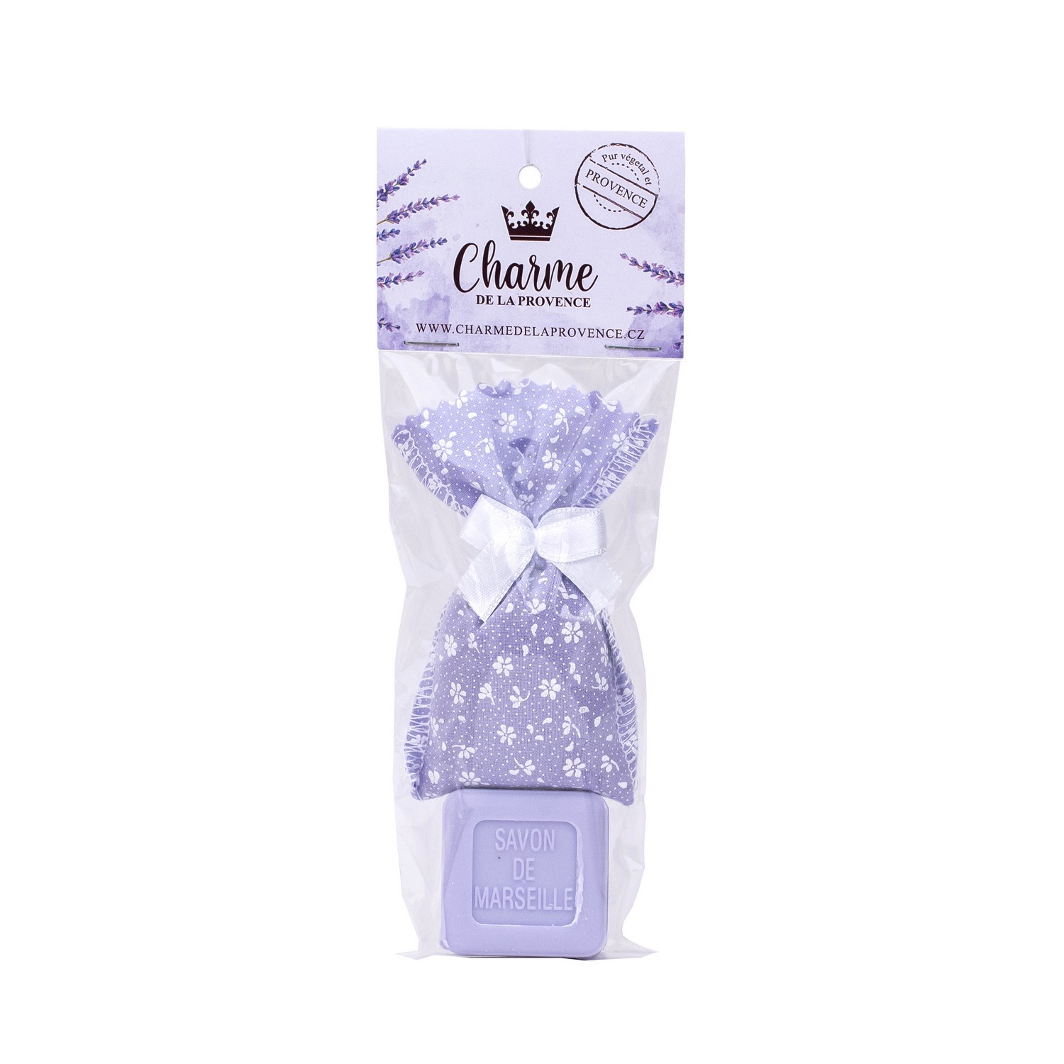 Plátěný pytlíček plněný sušeným květem levandule a levandinu s hranatým levandulovým marseillským mydélkem. Baleno v celofánovém sáčku s papírovou klopku.Pytlíček se používá k provonění skříní a zásuvek, odpuzuje moly a jeho vůně má uklidňující účinky, stejně jako vůně mydélka. Vhodné jako drobný voňavý dárek.