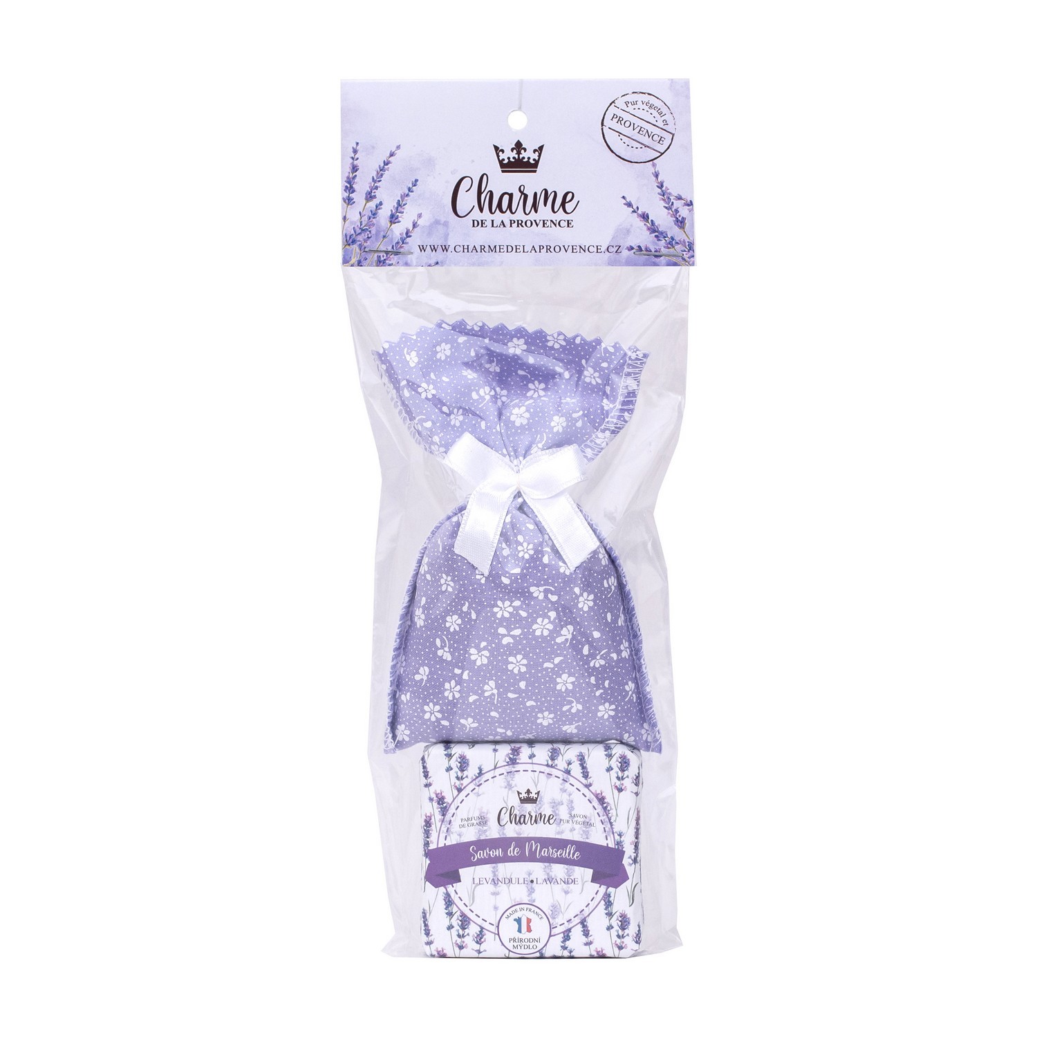 Látkový pytlíček plněný sušeným květem levandule a Marseillským mýdlem 50 g. Baleno v celofánovém sáčku s papírovou klopku.Pytlíček se používá k provonění skříní a zásuvek, odpuzuje moly a jeho vůně má uklidňující účinky, stejně jako vůně mydélka. Vhodné jako drobný voňavý dárek.