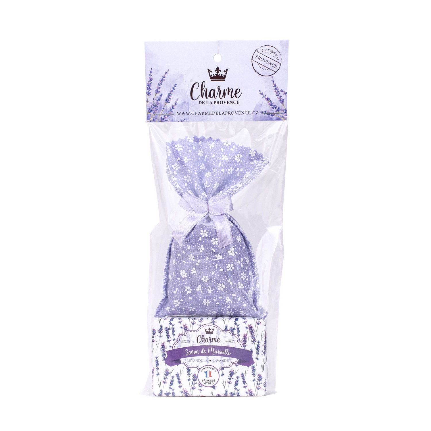Plátěný pytlíček plněný sušeným květem levandule a levandinu s Levandulovým Marseillským mýdlem 100g.Baleno v celofánovém sáčku s papírovou klopku.Pytlíček se používá k provonění skříní a zásuvek, odpuzuje moly a jeho vůně má uklidňující účinky, stejně jako vůně mydélka. Vhodné jako drobný voňavý dárek.